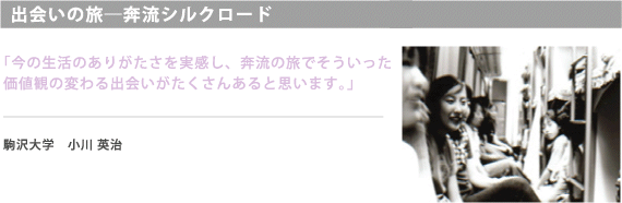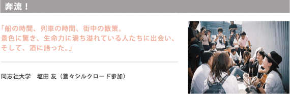 毎日が刺激的で、本当に有意義で一生忘れない旅になった。大阪港を出航し旅は始まった。中国大陸、西域シルクロード、先人たちが歩んだ道を列車とバスで横断。馬と大草原を思いっきり駆けた。夜は遊牧民と踊って歌った。バザールを散策。上海の大都会のド真ん中の公園でストリートサッカー…思い出が走馬灯のように頭の中を駆け巡っている。苛酷な自然環境の前にたじろいだ。古代の遺跡の前に足が止まった。生まれて始めてこんな澄んだ空を見た。星が近く、月が明るく、真っ青な青。今まで生きてきた自分というものを見つめ直す機会になった。