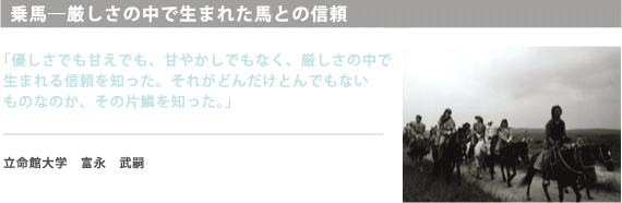 ―「現地民たちの馬への愛情と厳しさ包まれながら砂にまみれ、風を切り、大地を駆け、世界の広さを知るにつれて、乗るというよりは、一つになる、共に駆けるという感覚のが正しいと思える。」