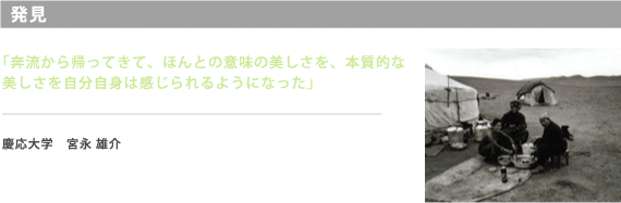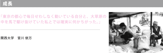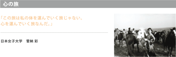 学生だった自分と社会人になった今の自分を重ねながら旅をした。キャラバン生活は、常に真剣勝負の連続。手綱を握りしめながら馬との葛藤。自然の厳しさを全身で受け止る。 逃げ場のない毎日。社会に出てふと草原から振り返ってみると、 難しいけれど、実はたくさん逃げ道やごまかしながら生きていたことに気づく。