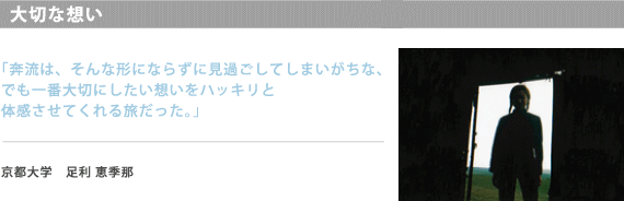 奔流の旅で、最も心に残ることばは、日本人は他人に何かをやってもらうことをあたりまえだと思いすぎているという言葉。モンゴル民族は、何かのためや、自分のためという狭い生き方をしていない。彼らはこの世界と共に生きているし、世界や自然がどんなものなのかを知るために生きている。日本人のように自分たちのつくったシステムのなかだけで、自分のことばかり考えて毎日を過ごしている人間にはない気高さがある。