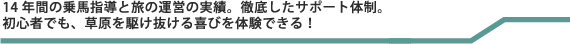 馬と一体になって草原を駆けぬける喜びを味わってほしい。騎馬民族の歴史、アイデンティティを馬上で感じてほしい。その思いから、主宰者の張宇さんは必ず自ら現場に赴き、常にすぐ傍らで見守り、あらゆる状況に素早く対処してくれます。スキル、言葉、情熱、統率力をあわせ持つ張さんがいるからこそ、安全なサポート体制と的確な乗馬指導のもと旅することができます。初心者でも1、2日すれば、自力で馬を操れ、風のように草原を駆けぬけています。