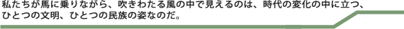 私たちが馬に乗りながら、吹きわたる風の中で見えるのは、時代の変化の中に立つ、ひとつの文明、ひとつの民族の姿なのだ。